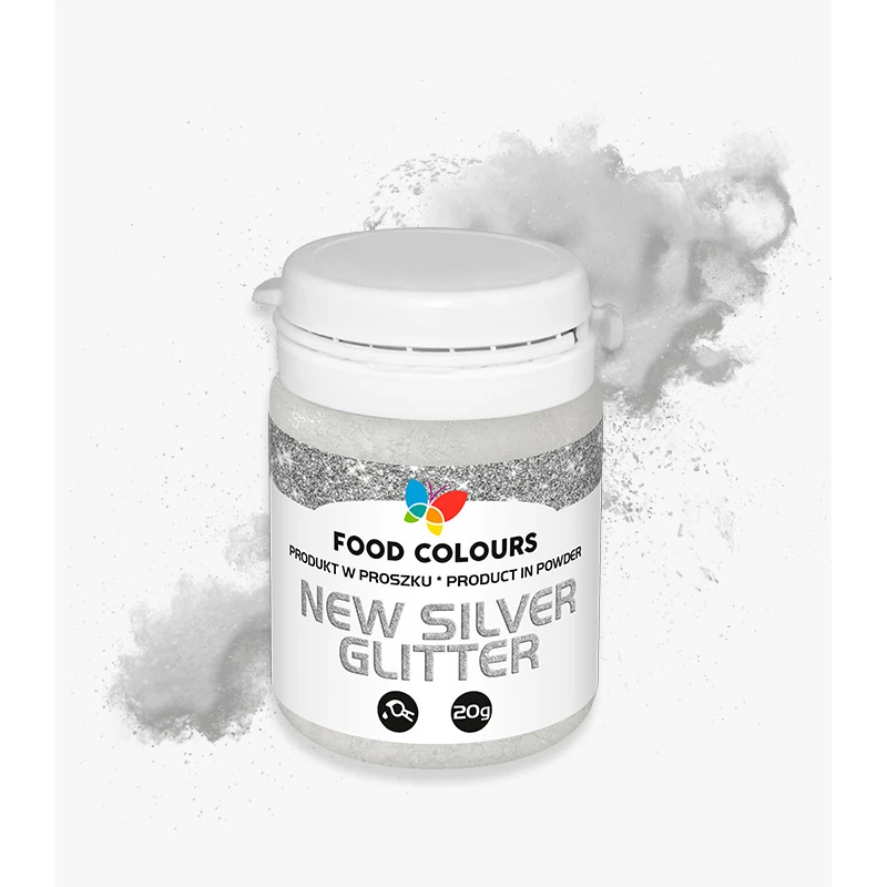 Brokat jadalny srebrny polskiej produkcji firmy FOODCOLOURS – bez E171 – New Silver Glitter, Nowe Srebro Brokat- 20g