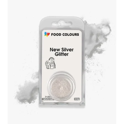 Jeśli marzy Ci się elegancki, srebrny brokatowy połysk, Food Colours New Silver Glitter spełni to zadanie w kilka chwil. To brokat spożywczy srebrny w proszku, który pięknie mieni się na dekoracjach i pozwala tworzyć spektakularny efekt brokatowej chmurki na tortach typu blow cake. A do tego sprawdza się również jako jadalny brokat do drinków – zarówno alkoholowych, jak i bezalkoholowych.