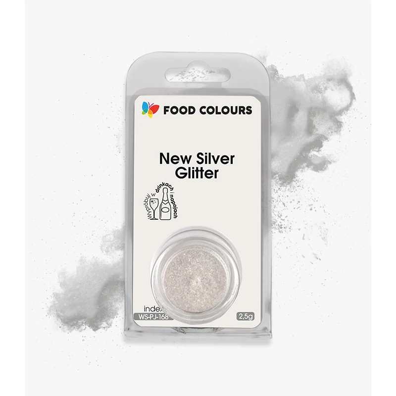 Srebrny brokat spożywczy bez E171. Do tortów blow cake i drinków. Food Colours New Silver Glitter 2,5 g – efekt metalicznej chmurki!