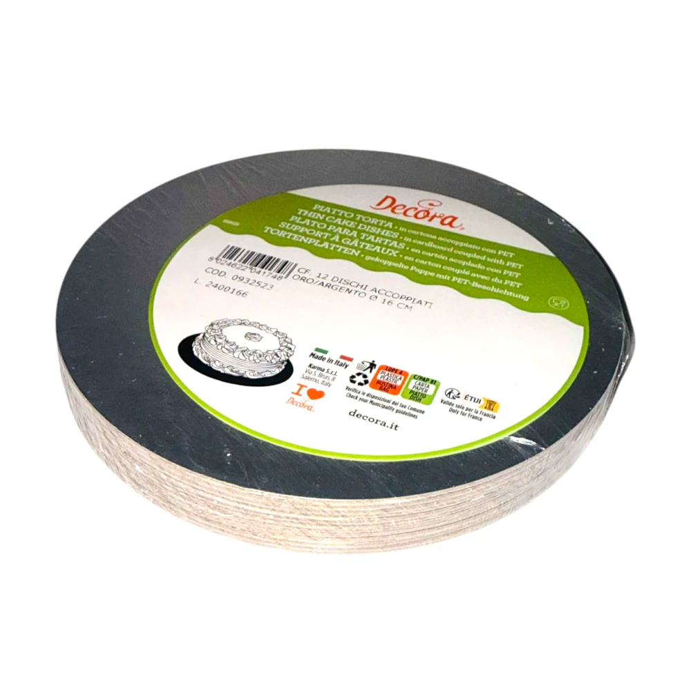 12 x Cienki podkład pod tort Okrągły Srebrno-Złoty Ø 16 cm, h 0,15 cm Decora