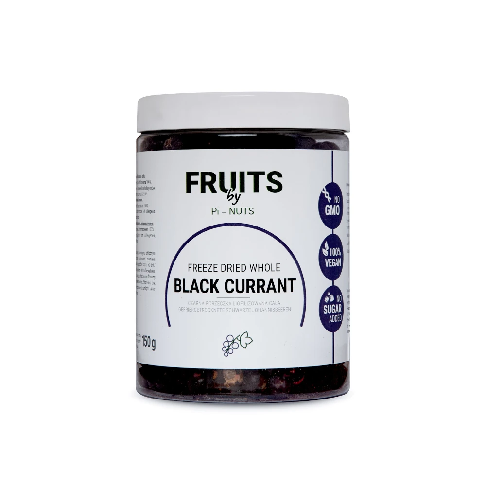 Czarna porzeczka liofilizowana – całe owoce – 150 g Pi-NUTS — intensywny smak lata przez cały rok