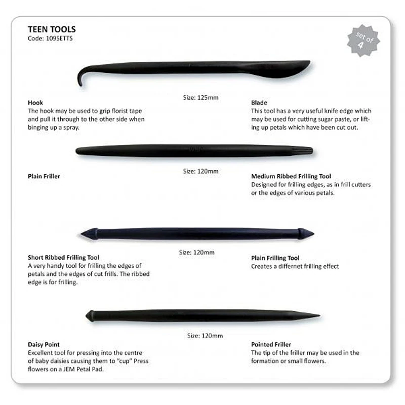 JEM Teen Tools 109SETTS: 4 narzędzia do modelowania masy cukrowej. Frillery, blade & hook i daisy point do kwiatów. Wygodne i precyzyjne!