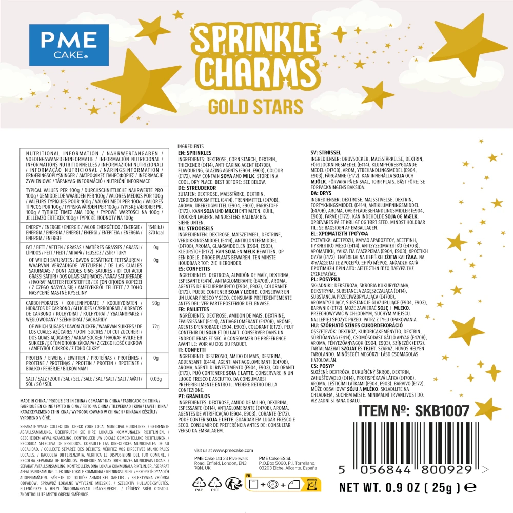 Posypki PME Sprinkle Charms to duże i efektowne posypki cukrowe, które w kilka sekund dodają wypiekom koloru, charakteru i tematycznego stylu. Dzięki wyrazistym kształtom są świetnym sposobem na szybkie wykończenie dekoracji – nawet prosty tort lub deser zyskuje profesjonalny wygląd.