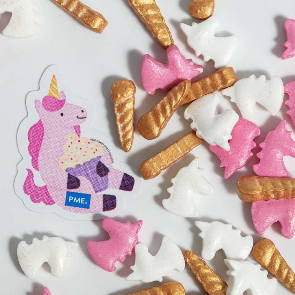 Jednorożce PME 25g – magiczne posypki cukrowe na tort: unicorny i złote skrzydełka. Idealne na pastel party.
