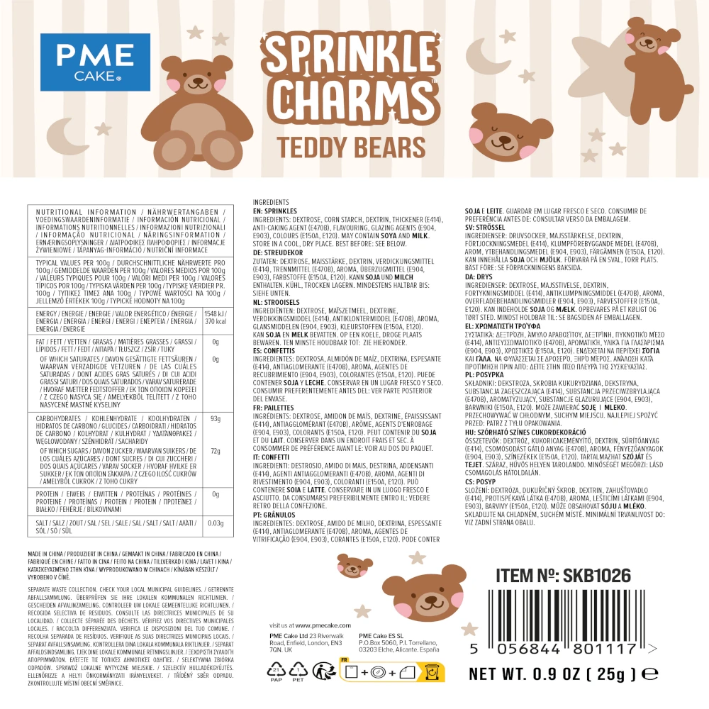 Posypki PME Sprinkle Charms to duże i efektowne posypki cukrowe, które w kilka sekund dodają wypiekom koloru, charakteru i tematycznego stylu. Dzięki wyrazistym kształtom są świetnym sposobem na szybkie wykończenie dekoracji – nawet prosty tort lub deser zyskuje profesjonalny wygląd.