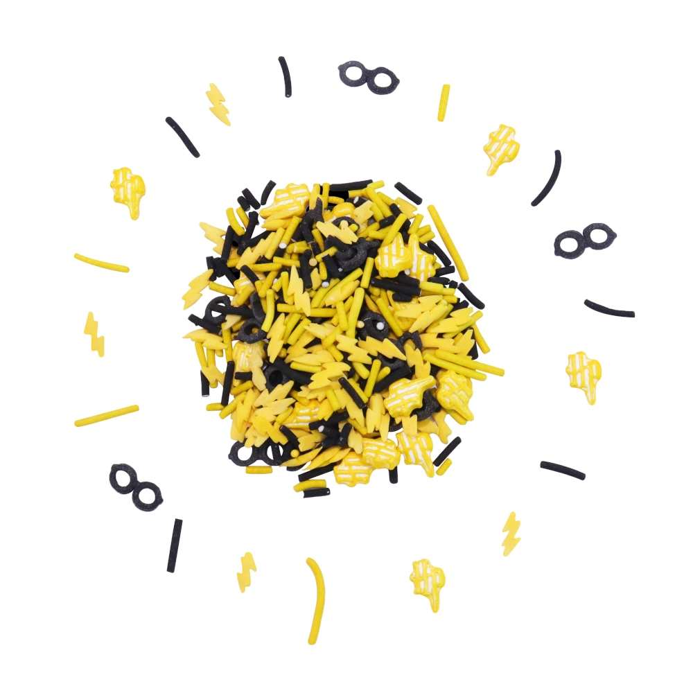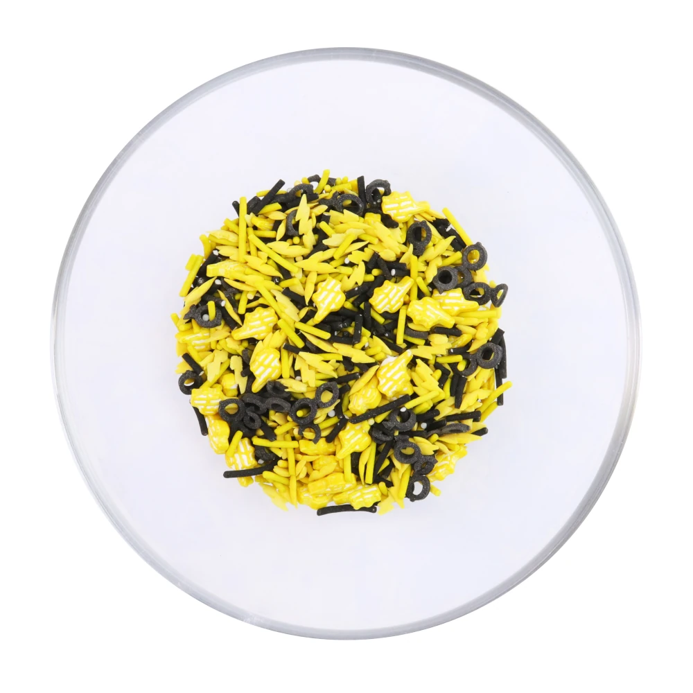 Kolorowa czarno-żółta mieszanka sprawia, że ta posypka cukrowa do tortów i babeczek pasuje do wielu różnych wypieków i przyjęć tematycznych.