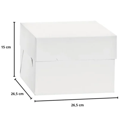 Karton o wymiarach 26,5 x 26,5 x 15 cm jest praktycznym wyborem do tortów na podkładzie 26 cm.