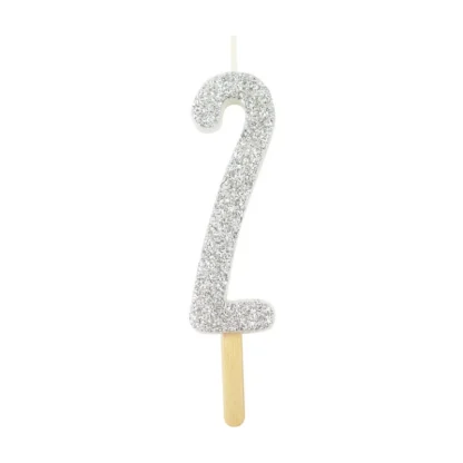 Srebrna Świeczka z Brokatem z Drewnianym Patyczkiem – Cyfra 2 – PME – CA122