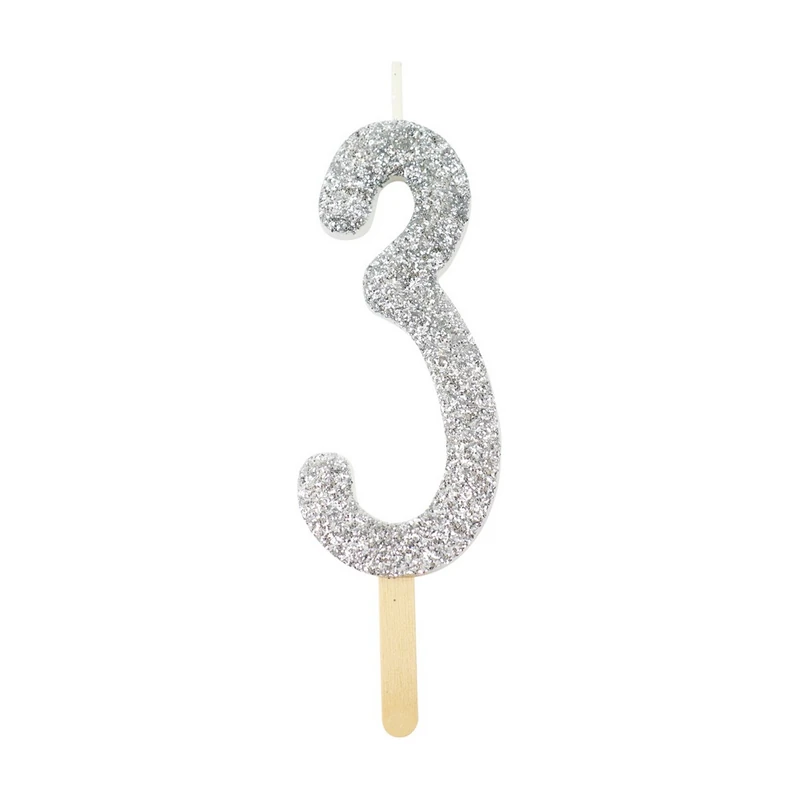 Srebrna Świeczka z Brokatem z Drewnianym Patyczkiem – Cyfra 3 – PME – CA123