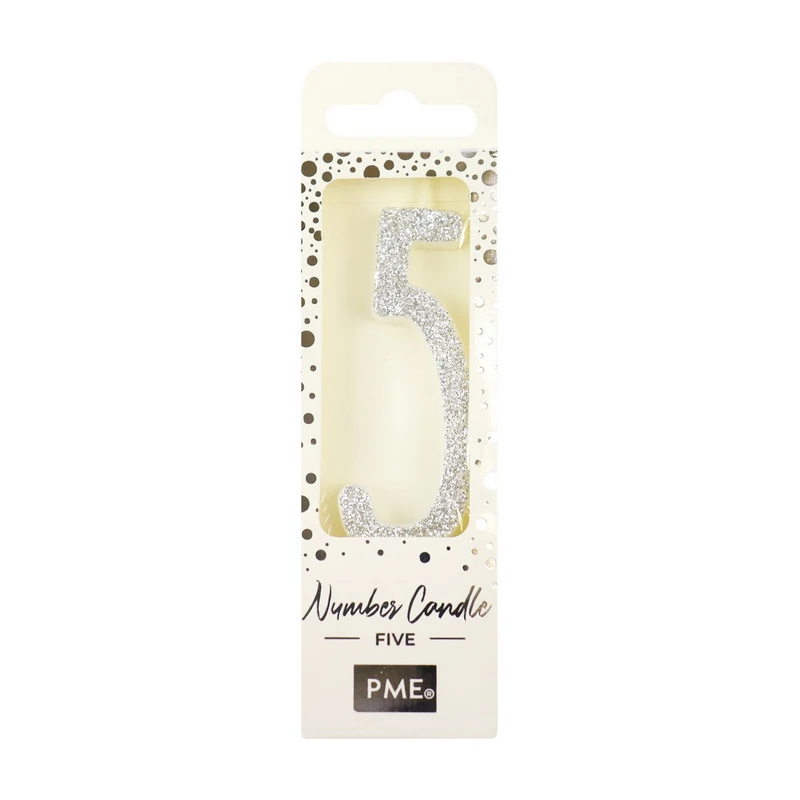 Srebrna Świeczka z Brokatem – Cyfra 5 – PME