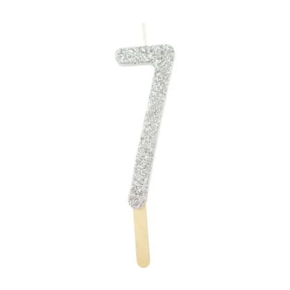 Srebrna Świeczka z Brokatem z Drewnianym Patyczkiem – Cyfra 7 – PME – CA127