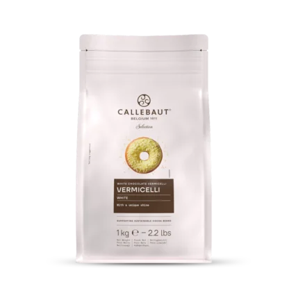 Vermicelli z białej czekolady Callebaut 1 kg – elegancka posypka czekoladowa do tortów, monoporcji i deserów.
