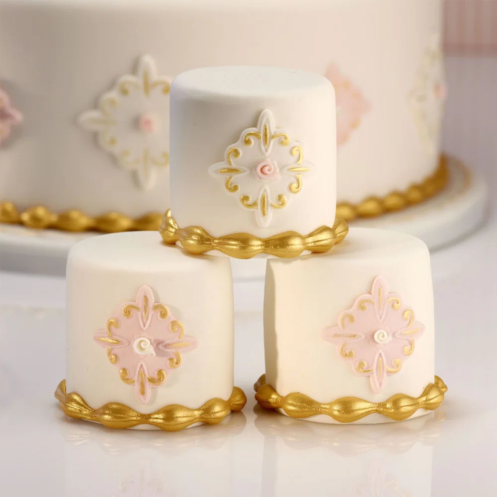Kwadratowa forma z delikatnie zaokrąglonymi liniami przypomina dekoracyjne kafle lub ozdobne ramki, które pięknie prezentują się na bokach tortu lub jako centralny element dekoracji.