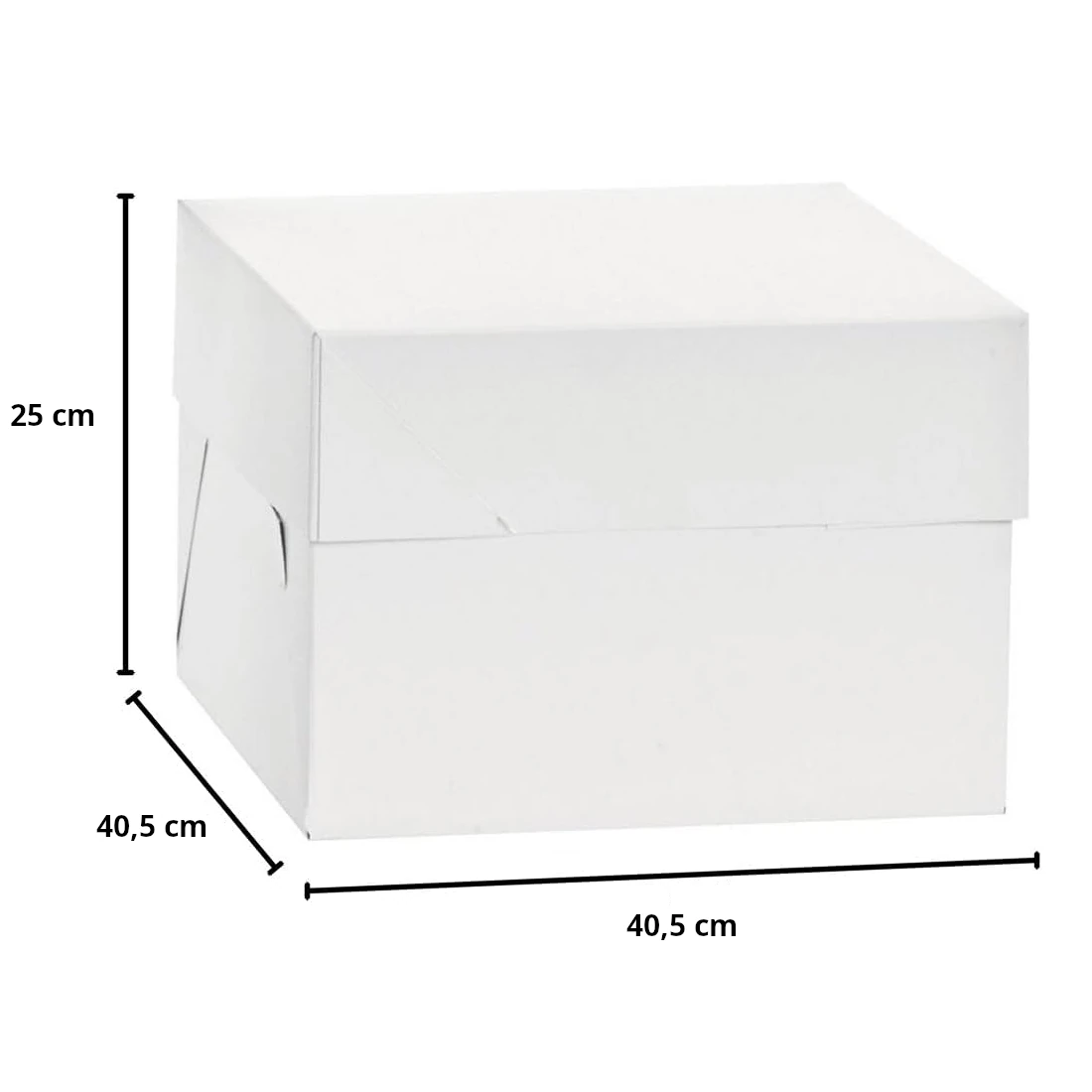 Karton o wymiarach 40,5 x 40,5 x 25 cm jest praktycznym wyborem do tortów na podkładzie 40 cm.